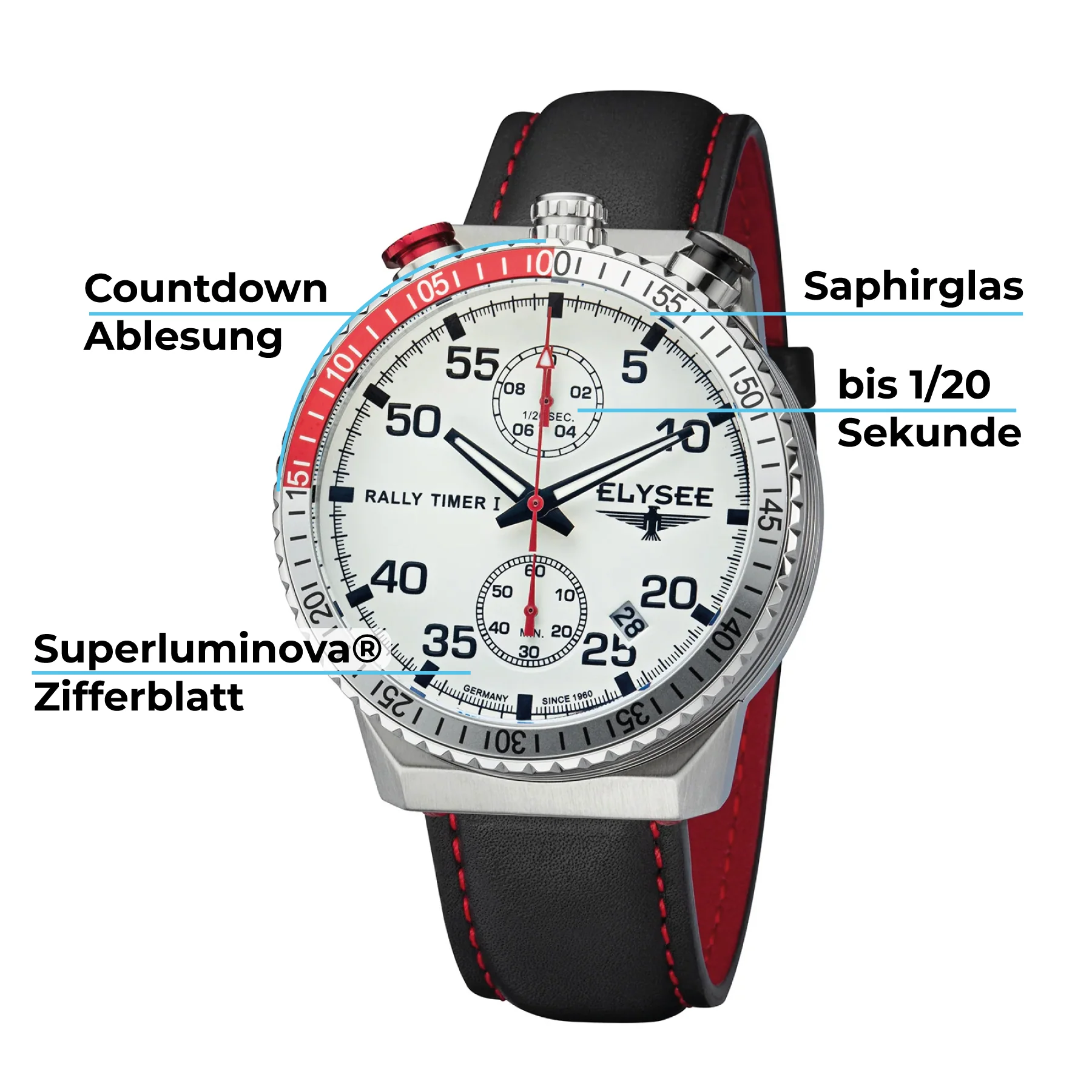 Der einzigartige Chronograph RALLY TIMER I wurde speziell für Sollzeit-Prüfungen im Rallye Sport hergestellt, dessen Besonderheit die Anordnung der Krone sowie der beiden farbigen Drücker ist, die wie bei Stopp-Uhren am oberen Gehäuserand angebracht sind. Diese ELYSEE hat ein poliertes und hochwertiges Edelstahlgehäuse mit einer speziell markierten Lünette. Diese Lünette erlaubt mit dem Chronographen-Sekundenzeiger eine Countdown Ablesung, unabdingbar für Sollzeit und Gleichmäßigkeits-Sonderprüfungen. Die Zeit lässt sich hochpräzise (bis 1/20 Sekunde) stoppen. Ein verbautes Superluminova®-Zifferblatt ermöglicht außerdem das Ablesen der Uhrzeit bei Nacht, verfügt über eine Datumsanzeige und wird durch ein saphirbeschichtetes und entspiegeltes Glas sowie einen verschraubten Gehäuseboden geschützt.