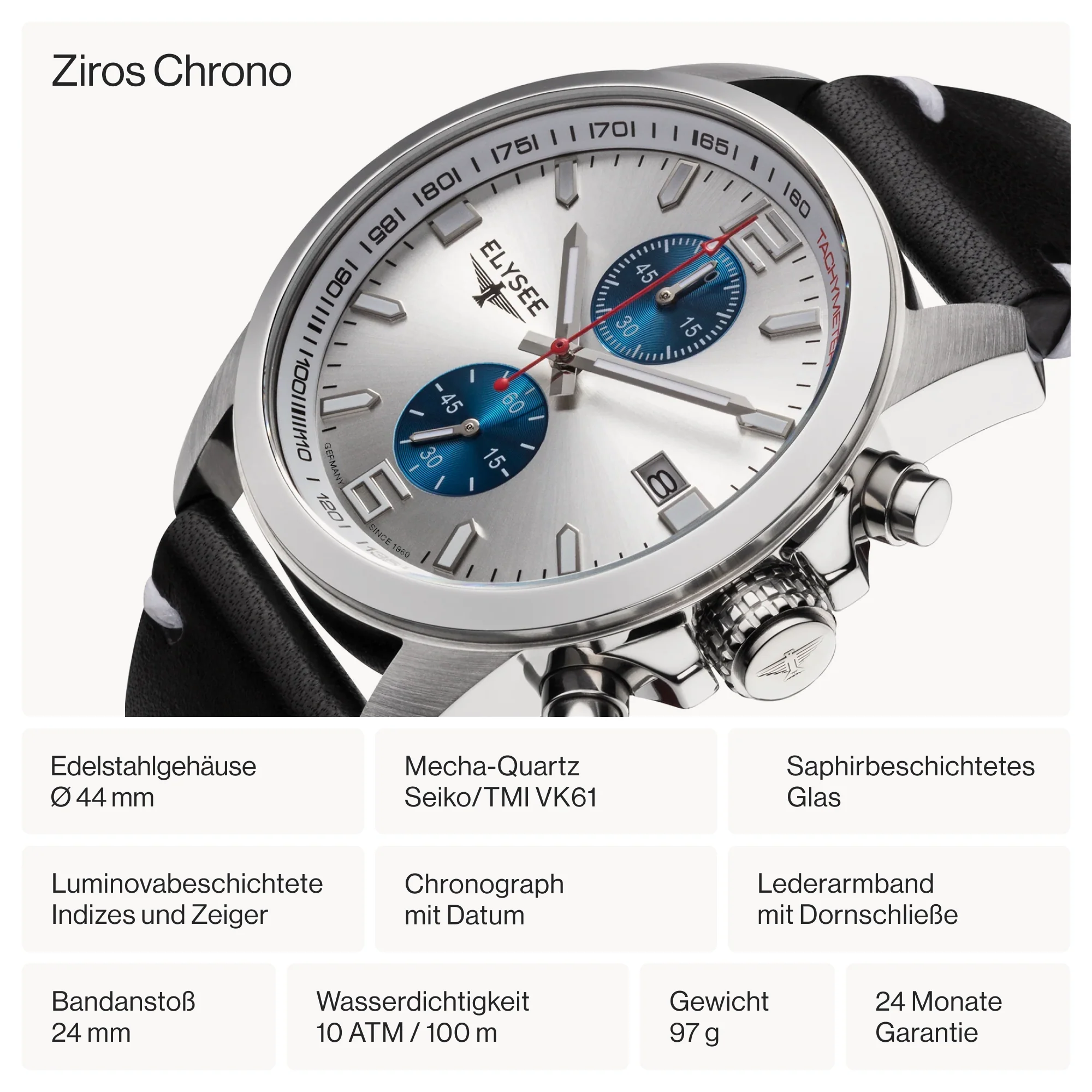 Der Chronograph ZIROS CHRONO vereint mit seiner hochwertigen Formgebung funktionale und optische Gesichtspunkte zu einer eleganten und sportlichen Armbanduhr. Sein unverwechselbares Aussehen erhält der Chronograph insbesondere durch die zwei Totalisatoren auf der 12- und 6-Uhr-Position, die einen farblichen Kontrast zum geschliffenen Zifferblatt bilden. Geschützt durch ein poliertes und teilweise gebürstetes Edelstahlgehäuse sowie einem saphirbeschichtetes Glas und aufgewertet mit einem Lederarmband im Vintage-Stil entsteht eine charakterstarke und sportliche Uhr fürs Handgelenk.
